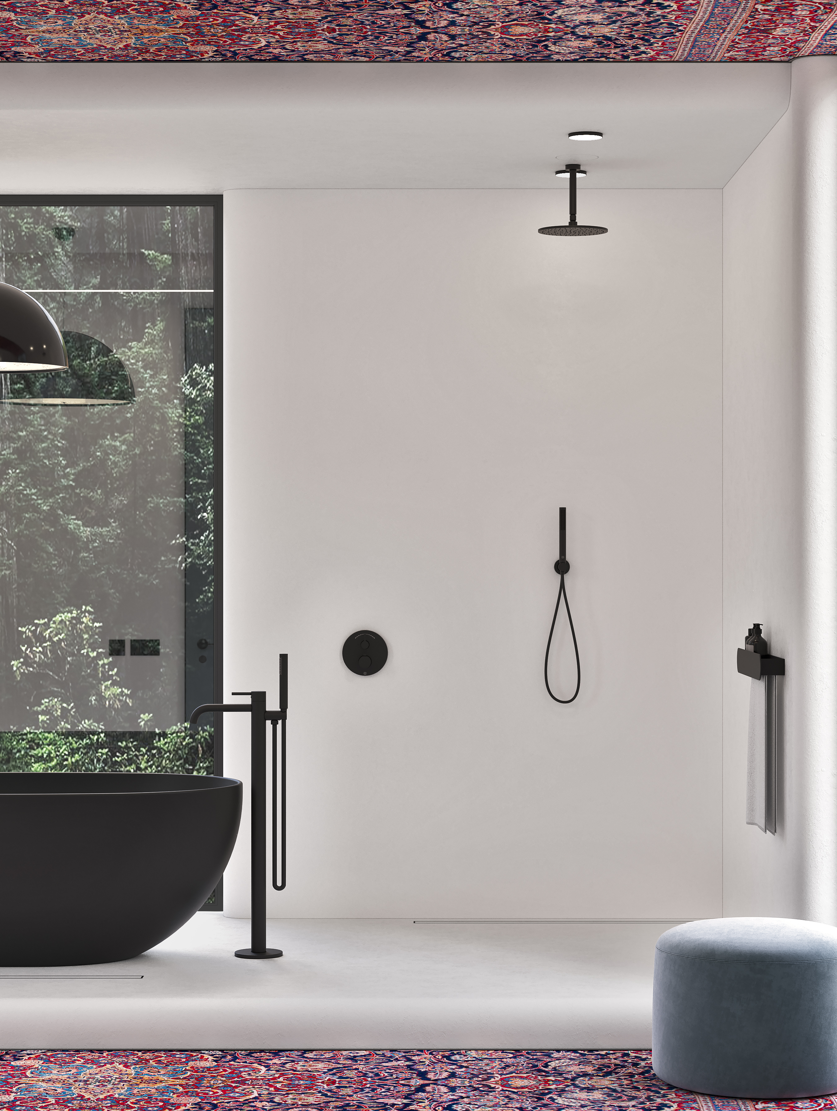 Радиальная форма внешних углов, белый и чёрный цвет в сочетании с яркими, акцентными элементами задают пространству особую атмосферу. В такой ванной можно легко отключиться от внешнего мира и погрузиться в особую атмосферу.
