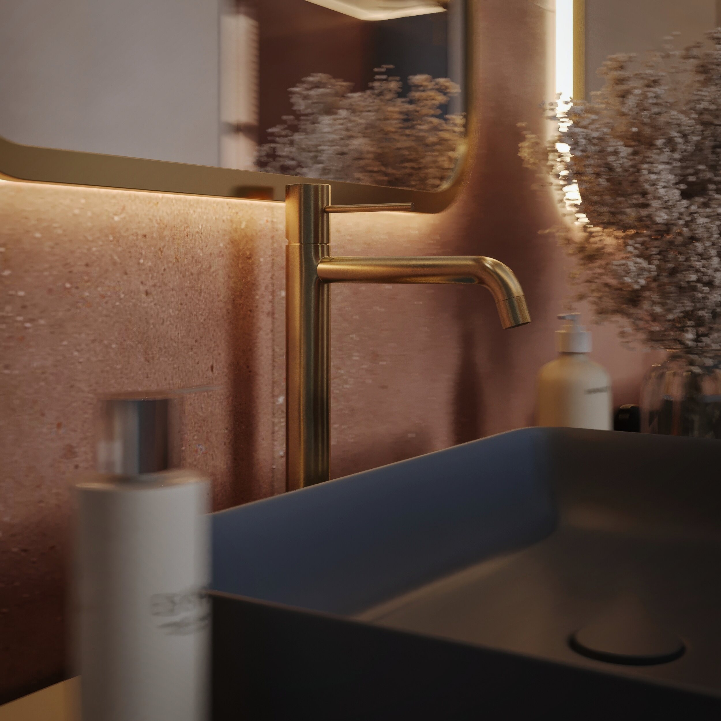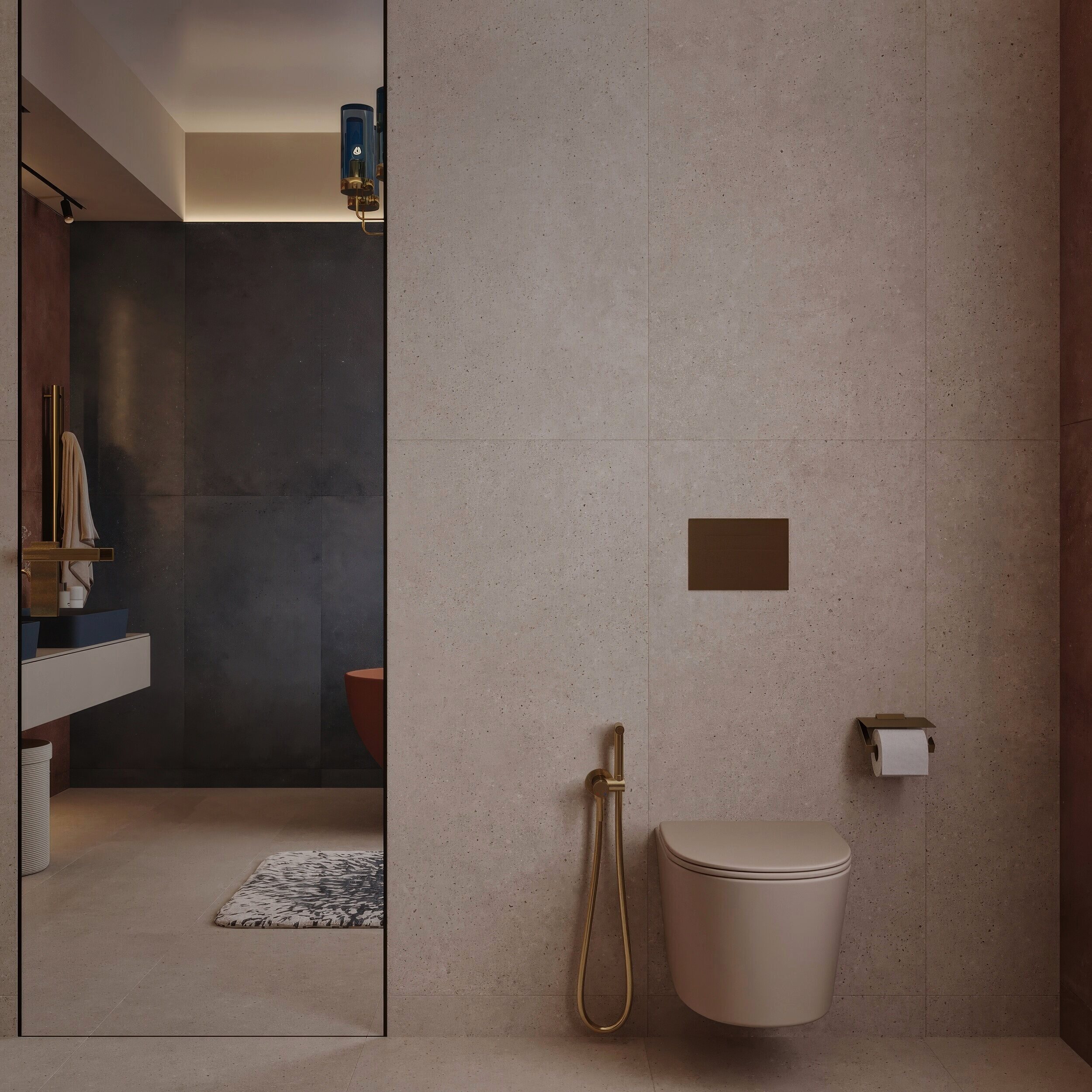 Мастер-санузел для молодой пары, стремящейся к смелым и нестандартным решениям. Основной концепцией стало сочетание двух ярких цветов, что было реализовано с помощью сантехники от Аквамира: отдельно стоящей ванны глубокого терракотового оттенка и выразительной синей раковины. Контрастная палитра гармонично дополняется бежевым унитазом, создавая сбалансированный цветовой ансамбль. Для усиления эффекта плитка была подобрана в тон сантехники, а акцентные элементы — смесители, кнопка смыва, напольный смеситель для ванны — выполнены в элегантном золотом цвете. Такое сочетание материалов и оттенков подчеркивает современный стиль интерьера, придавая пространству индивидуальность и глубину.